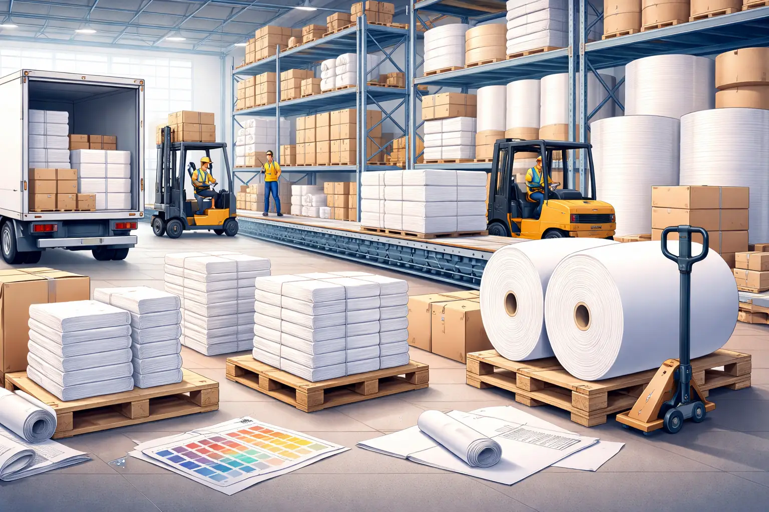 Kami memastikan ketersediaan bahan baku kertas tetap terjaga melalui manajemen stok yang terkontrol dan sistem distribusi yang responsif. Dengan dukungan armada dan jaringan logistik yang efisien, pengiriman dilakukan secara cepat dan tepat waktu untuk menjaga kelancaran produksi pelanggan.